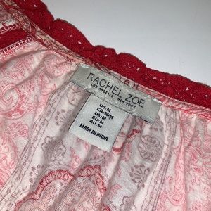 EUC Rachel Zoe red, orange, and cream boho balloon sleeved mixed print top with crocheted trim in women’s size medium.