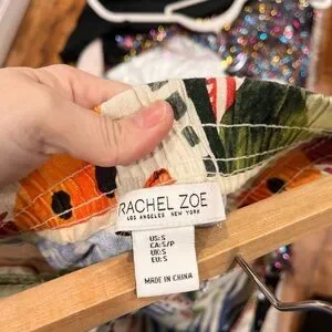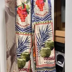 Stylish pants with a multicolor pattern. Features red, green, and orange details. Ideal for a chic look.