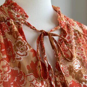Rachel Zoe Orange Chiffon Floral Metallic Flutter Blouse with Smocked Hem – US M