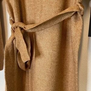 Craft a trendy city look with the Rachel Zoe Sweater Dress, a perfect blend of comfort and style for any business or casual occasion. This women's size small dress features a chic turtleneck and a versatile midi length, complemented by a trendy slit and a belt to cinch your waist. Its solid tan hue makes it easy to pair with your favorite accessories, while the knit fabric offers a cozy feel. It measures 17 inches from pit to pit but stretches to 20 inches. Would also fit size medium well.