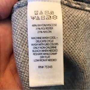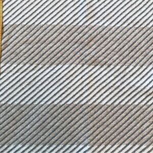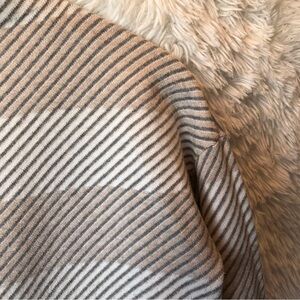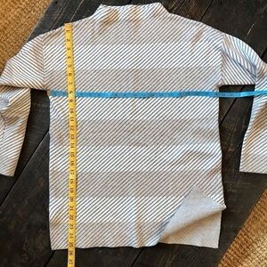 Great top in excellent pre-loved condition. Beautiful, soft sweater with diagonal stripes woven into the horizontal beige and white stripes, mock turtleneck, side slits at the bottom hem.