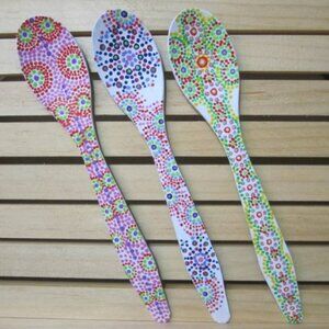 Each spoon measures 7.25″H x 1.25″W, Aspen Wood, Acrylic paint w/ acrylic high gloss glaze.