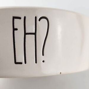 New, Rae Dunn 4" pet, cute dog or cat bowl dish, Artisan Collection with large letters EH? etched on the side.