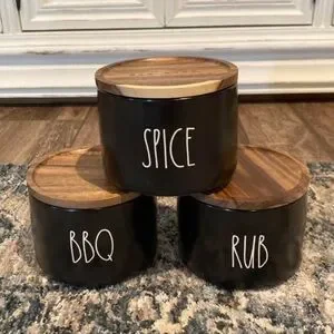 Elegant black spice storage containers with wooden lids, perfect for organizing your kitchen essentials.