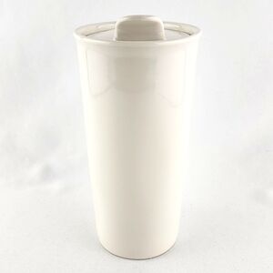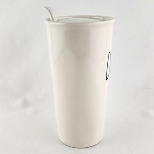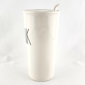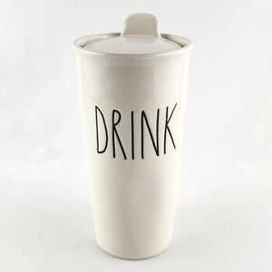 Excellent pre-owned condition, Rae Dunn Artisan Collection by Magenta tall ceramic travel insulated coffee/ tea tumbler with lid, in glossy white with fun large letters DRINK engraved on one side and a glossy white interior.