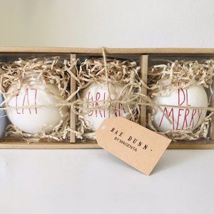 Rae Dunn By Magenta ceramic Christmas ornaments set of 3 featuring red text that say “EAT” “DRINK” and “BE MERRY”. Each ornament measures approximately 3 inches in diameter. Designed to have a hand made look. Great for your Christmas tree or as decor
