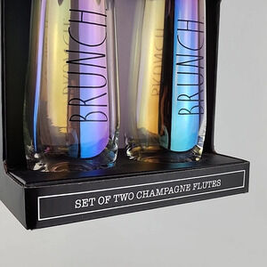 New in box, set of two stemless iridescent glass champagne flutes with large letters BRUNCH.
