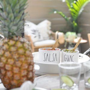Magenta x Rae Dunn ceramic stoneware bowls with serving spoons. Bowls are in an off white colour with "Salsa" and "Guac" engraved into the side. Two bamboo serving spoons included. Bowls are dishwasher safe. Spoons are hand wash only.