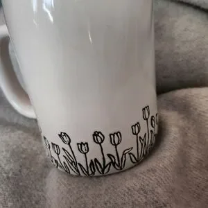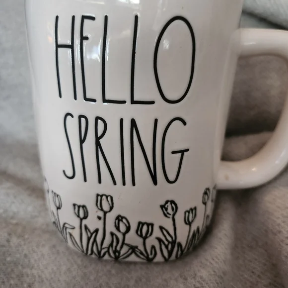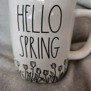 Rae Dunn spring mig. Welcome the season with the Hello Spring Ceramic Mug. This charming white mug features a delightful floral design, perfect for enjoying your favorite hot beverages. New never used