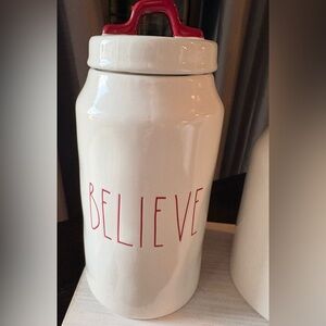 Festive Rae Dunn canisters with cheerful messages. Perfect for holiday decor.
