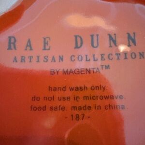 Charming orange dish with Rae Dunn's signature style. Ideal for seasonal decor.