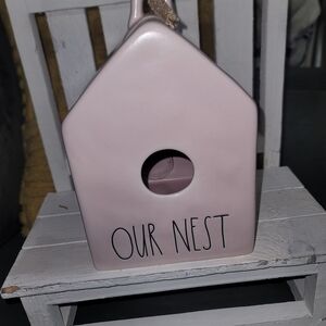 Charming pink ceramic birdhouse by Rae Dunn, perfect for adding a touch of elegance to your garden. Features the phrase 'Our Nest' for a cozy feel.