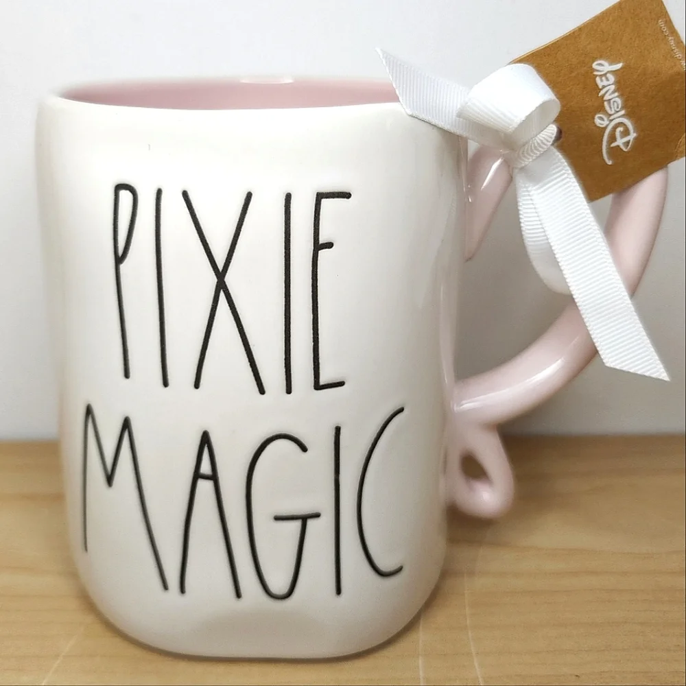 Rae Dunn ceramic mug with "PIXIE MAGIC" lettering. White exterior with pink interior and handle. Simple, whimsical design. Dishwasher safe ceramic look.