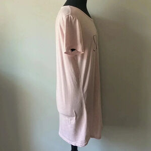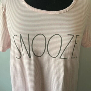 * size medium * stock photos to show fit * pit to pit 20” * length back down 34” * pink & white stripe with grey Snooze printed on front * small hole lower left side - see pic * smoke free home * bundle & save