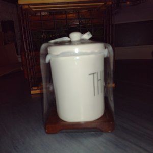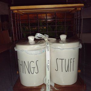 Rae Dunn Set of Things and Stuff canisters and tray.