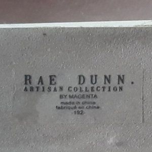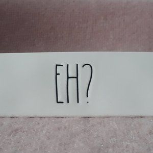 - White ceramic with "Eh?" written on one side in Rae Dunn's distinctive black script