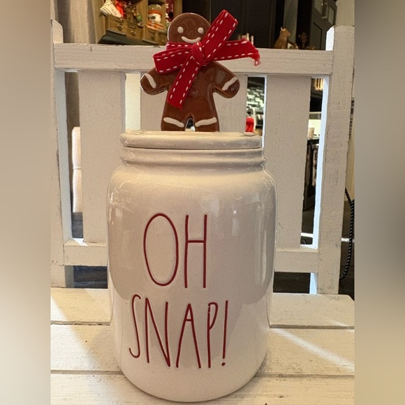 Festive Rae Dunn cookie jar with 'Oh Snap!' design. Features a gingerbread man with a red bow. Perfect for holiday treats.