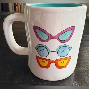 Chic Rae Dunn mug with 'Throwing Shade' design. White exterior, teal interior. Ideal for coffee lovers.