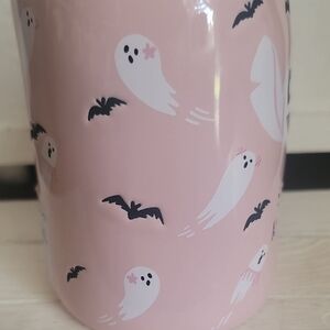 Charming pink mug with a spooky face and bats and ghosts with saying "Spooky And Cute" Perfect for Halloween.
