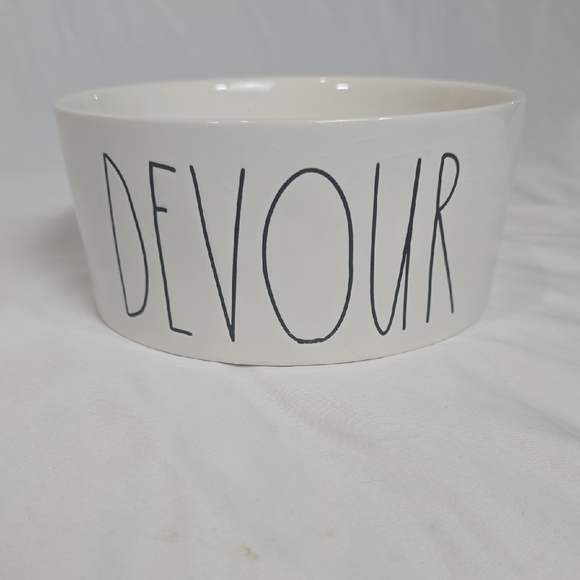This is a Rae Dunn by Magenta "Devour" ceramic bowl. It is part of the Artisan Collection and is produced as both a pet bowl and a cereal/ice cream bowl.
