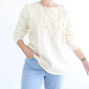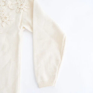 Rafaella Cream 52% Lambswool Floral Applique Knit Sweater Med
