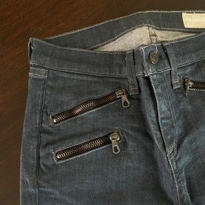 Rag & Bone Kensington Zipper jeans in Aliso - a blue/gray. Ankle length, skinny stretch, zippers on front and at ankles. Light subtle factory distressing.