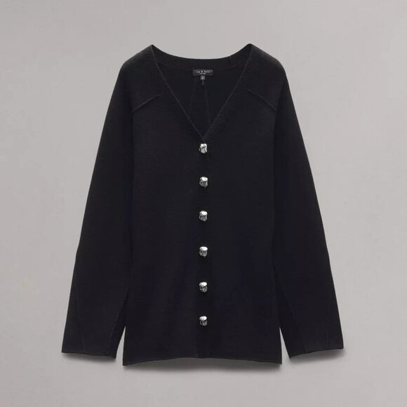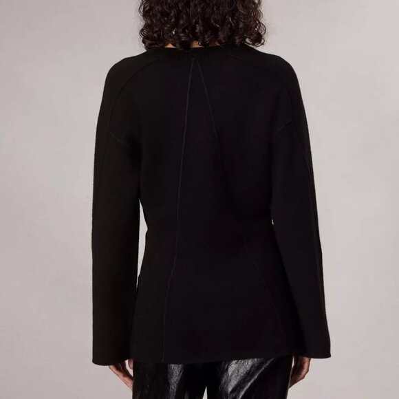 Double-faced knit stretch wool-blend cardigan. Raised seams throughout.