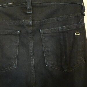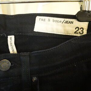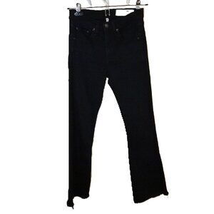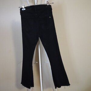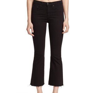 Rag & Bone Cropped Flare Denim in Black with Distressing on Hemline. Size 23. Features low-waist, flare fit and five pocket styling.