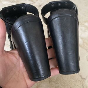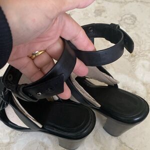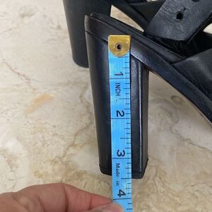 Black leather with studded accents. Beautiful multi strap & adjustable closure at ankles and stacked heel.