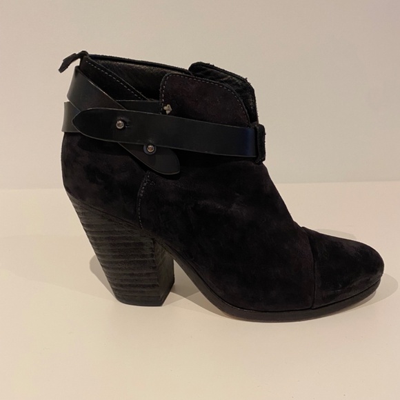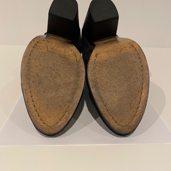 Lightly worn black suede booties with 3.5” stacked heel.