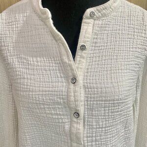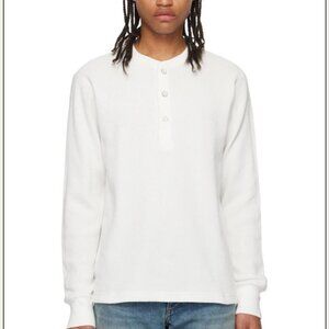 Mens Ivory (off-white) Crewneck by Rag & Bone. This timeless long sleeve shirt is made from 100% cotton, is waffle-knit, has rib knit crewneck and cuffs, a three-button placket and a central seam at the back. It is in excellent "like new" condition and size large.