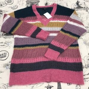 A multicolored stripe print adds vibrancy to this signature V-neck sweater that is great for winter wear.