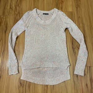 Pinkish and white with distress detail on sleeves and rib knit trim.