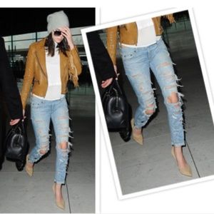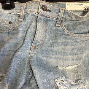 Rag & Bone The DRE Thrasher distressed shredded light wash low rise denim jeans. Slight whiskering intentionally shredded destroyed legs 98% cotton 2% polyurethane Made in USA Size 27 Excellent used condition Revolve Bohemian Frayed