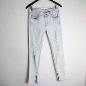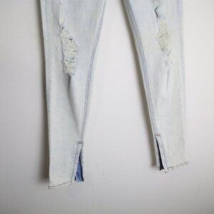 Light wash denim with bleached, vintage-inspired finish. Multiple ripped and frayed areas throughout both legs. Prominent shredding at the knees. Slim, tapered skinny fit