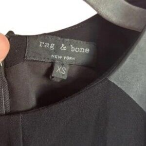 The Rag & Bone Nudie top is a black sleeveless top known for its sleek design and distinctive detailing. It features contrasting faux leather details, particularly noticeable at the shoulders in both the front and back, adding a touch of edge and sophistication. Includes a concealed zipper closure at the back, ensuring a smooth and clean fit without disrupting the garment's lines. Easy way to dress up jeans, it also pairs well with more formal bottoms for a polished look.