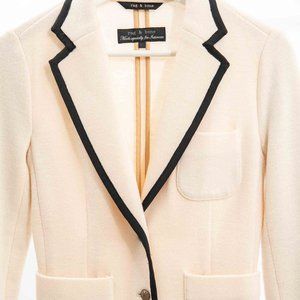 Made exclusively for Intermix, this gorgeous cream knit blazer with black trim is a classic tailored staple for any wardrobe. Featuring a two button closure and patch pockets.