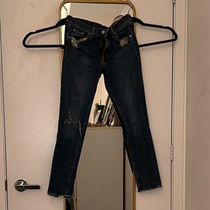 Intentionally destroyed areas. Slight whiskering along the front pockets. Intentionally frayed leg openings.