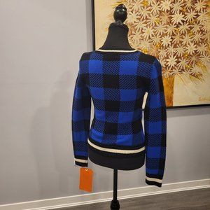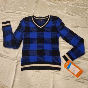Marino wool, V-neck, long sleeve buffalo check sweater with ribbing along the waist and cuffs.