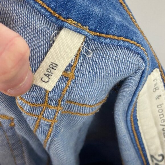 Rag & Bone Mid Rise Capri Jeans in Women's Size 24. Medium blue colour called Finch. Cotton, lyocell, rayon, bemberg cupro and polyurethane. Made in the USA. Machine washable. Good pre-loved condition but note there is some puckering - see photos.