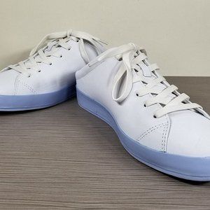Sport is an essential part of Rag and Bone's sophisticated and refined urban style. The RB1 sneaker mule combines these two elements in an on-trend season staple. This crisp white leather tie front sneaker features a slide on backless silhouette and chambray light blue platform sole.