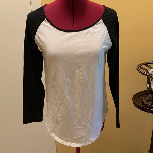 Stylish black and white raglan sleeve top perfect for casual outings. Comfortable and versatile for everyday wear.