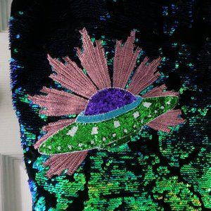 Live your best space princess life in this amazing t-shirt/sweater dress from UK brand Ragyard. Sparkling iridescent sequins in a marbled pattern on black velvet with planet and UFO sequin patches. Rib velvet at the collar. Has some weight to it, with a nice drape.