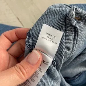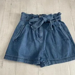 Zip fly with button closure. Side pockets. Paperbag waist with optional tie belt. Supple denim fabric