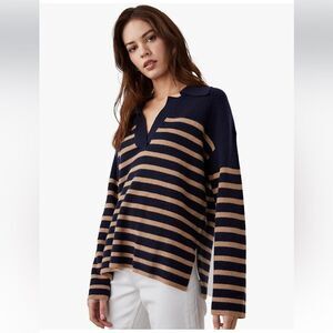 Soft and cozy wool cashmere-blend polo sweater with its exaggerated collar and deep v-neck. This polo style sweater comes in a slightly oversized fit and dropped shoulders