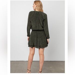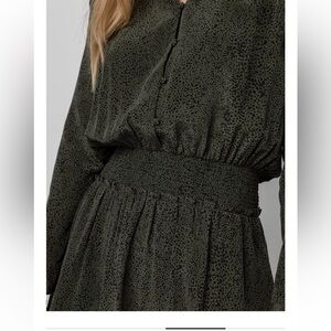 NWT Lightweight, luxe rayon, long sleeve v-neck mini dress with olive green snake print throughout featuring button-down front detail, smocked waistline, and double layered tiered skirt. A pullover style body with elastic waistline and flowy skirt makes for easy wearability with feminine appeal.