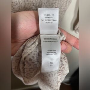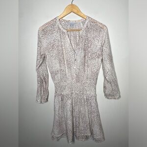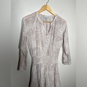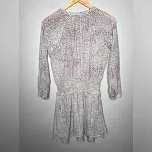 No signs of obvious wear. Beautiful feminine little dress. In the colourway “tan watercolor leopard” A pullover style body with an elastic waistline and flowy skirt makes for effortless dressing with a feminine touch. Made from lightweight crepe, this long sleeve ivory v-neck mini dress features a watercolor leopard print design and buttons at center front.