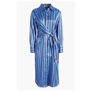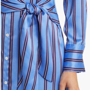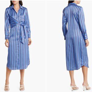 Wrap yourself in luxury and prepare to go anywhere. The Lacey Dress is made from shiny twill and features an elevated stripe print, buttondown silhouette, and unique adjustable wrap tie at the waist.