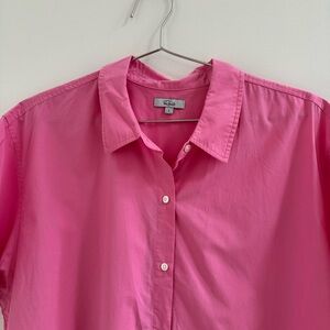 Bright pink button-up shirt. Short sleeves with rolled cuffs. Classic collar design.