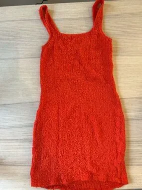 Fitted mini dress with textured fabric and tank straps. Square neckline and streamlined silhouette. Bright red color ideal for day or night.